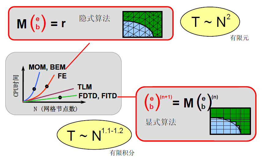 此算法从数学上保证,其可计算的电尺寸要比有限元法和矩量法等需要矩阵求逆的算法所能计算的要大得多。因为FEM/MoM 是隐式算法,需要进行矩阵求逆方可解出所需的电磁场量。从数学上讲,对满秩阵(MoM),矩阵求逆所需的内存和时间与网格数的三次方成正比;对大型稀疏矩阵(FEM),矩阵求逆所需的内存和时间与网格数的平方成正比;而FIT/FDTD 是显式算法,不需要进行矩阵求逆,所需的内存和时间基本上与网格数的平方成正比。