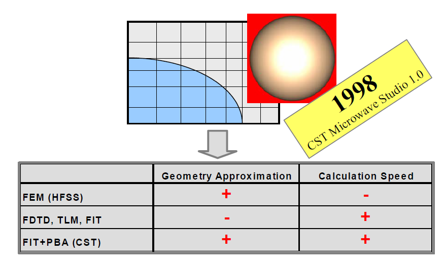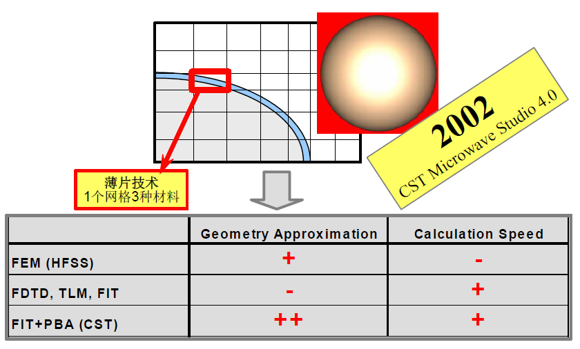 1998 年引入了专有的PBA(PerfectBoundary Approximation)技术,对一个网格被两种材料分成两块的情况,此方法采用解析的方式,在程序内部进行处理,让曲面物体保持原本光滑的形状。弥补了FDTD 类算法对曲面物体近似度差的缺点,使结构逼近趋近好。此方法采用插值的方式,弥补了FDTD 类算法对曲面物体近似度差的缺点,同时又保有网格划分容易、对大问题快速及内存需求小这三大原有的优点。