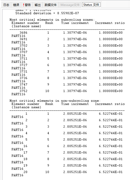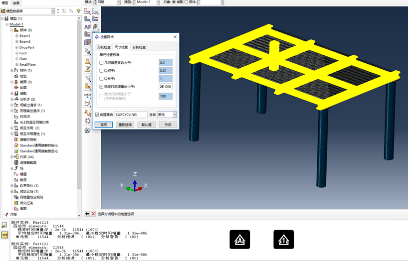 划分好网格后,使用ABAQUS网格检查工具,提取出稳定时间增量步小于2E-6的单元区域,并创建Element Set,名为SUBCYCLING。另,如下图所示,整体的小时间增量步为1.31E-6.将来计算时,黄色区域内将按照1.31E-6步进,而其余区域按2E-6步进。