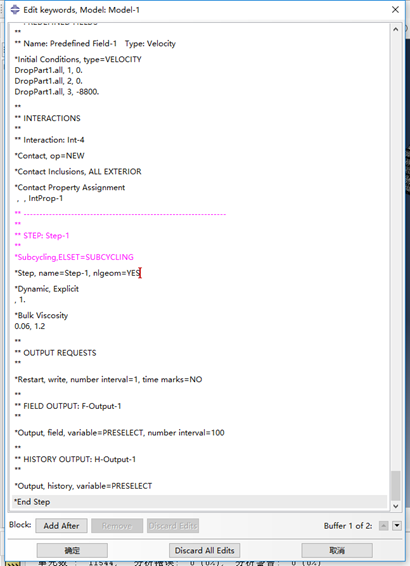 启动关键字编辑器,在需要使用SUBCYCLING的分析步前方,加入SUBCYCLING关键字并设置相关Element Set。