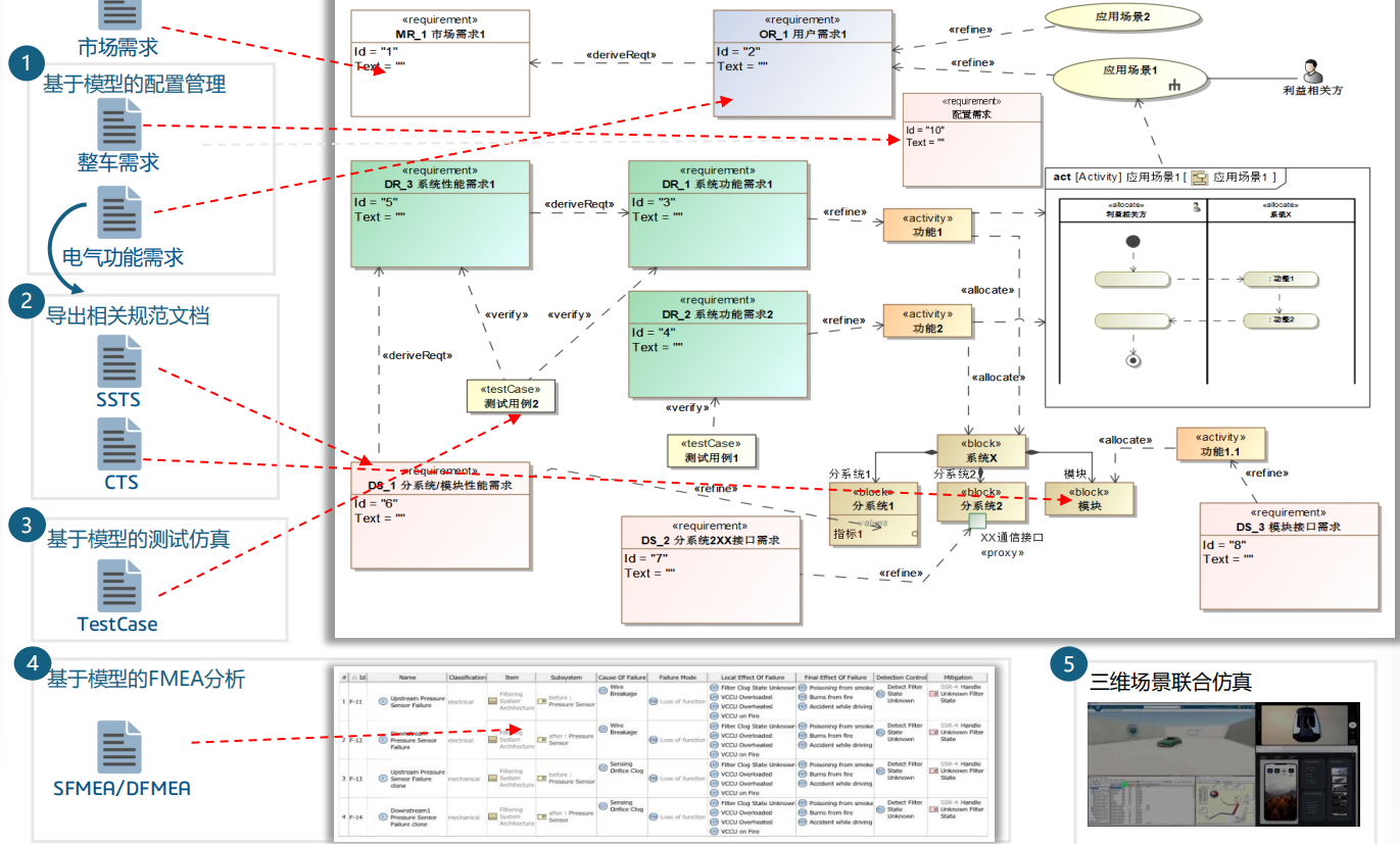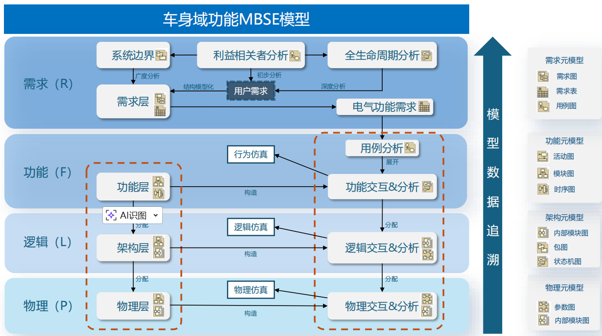 基于RFLP(需求 - 功能 - 逻辑 - 物理)方法论,搭建结构化的系统建模框架:从利益相关者分析与全生命周期分析入手,明确车身域电气功能需求,通过需求图、用例图等工具实现需求模型化;在功能层完成功能交互分析与行为仿真,逻辑层开展架构设计与逻辑仿真,物理层实现物理架构设计与物理交互验证,全程确保数据可追溯、需求有迹可循。