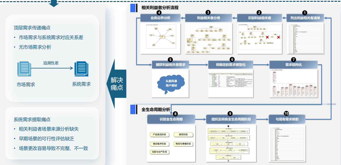 传统模式下,市场需求与系统需求的对应关系模糊,缺乏结构化的利益相关者场景分析,早期需求可行性评估缺失。更关键的是,需求传递依赖离散文档,追溯性差,场景更改易导致需求不完整、不一致,最终造成研发方向与市场需求脱节。