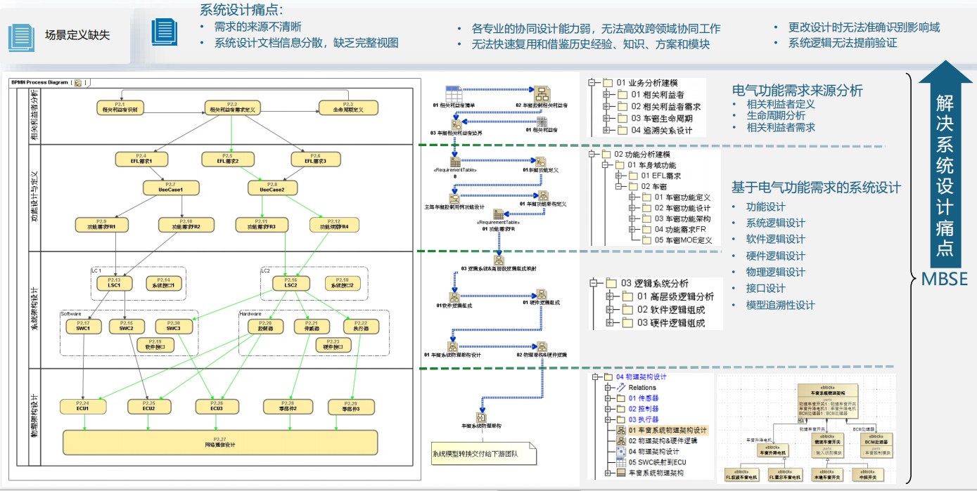 基于文档开展电气功能设计与沟通,导致各专业(机械、电子、软件、硬件、网络)设计相对独立,跨领域协同能力薄弱。同时,需求来源不清晰,设计变更时无法精准识别影响域,往往需要投入大量人力物力进行人工核对,严重制约研发效率。