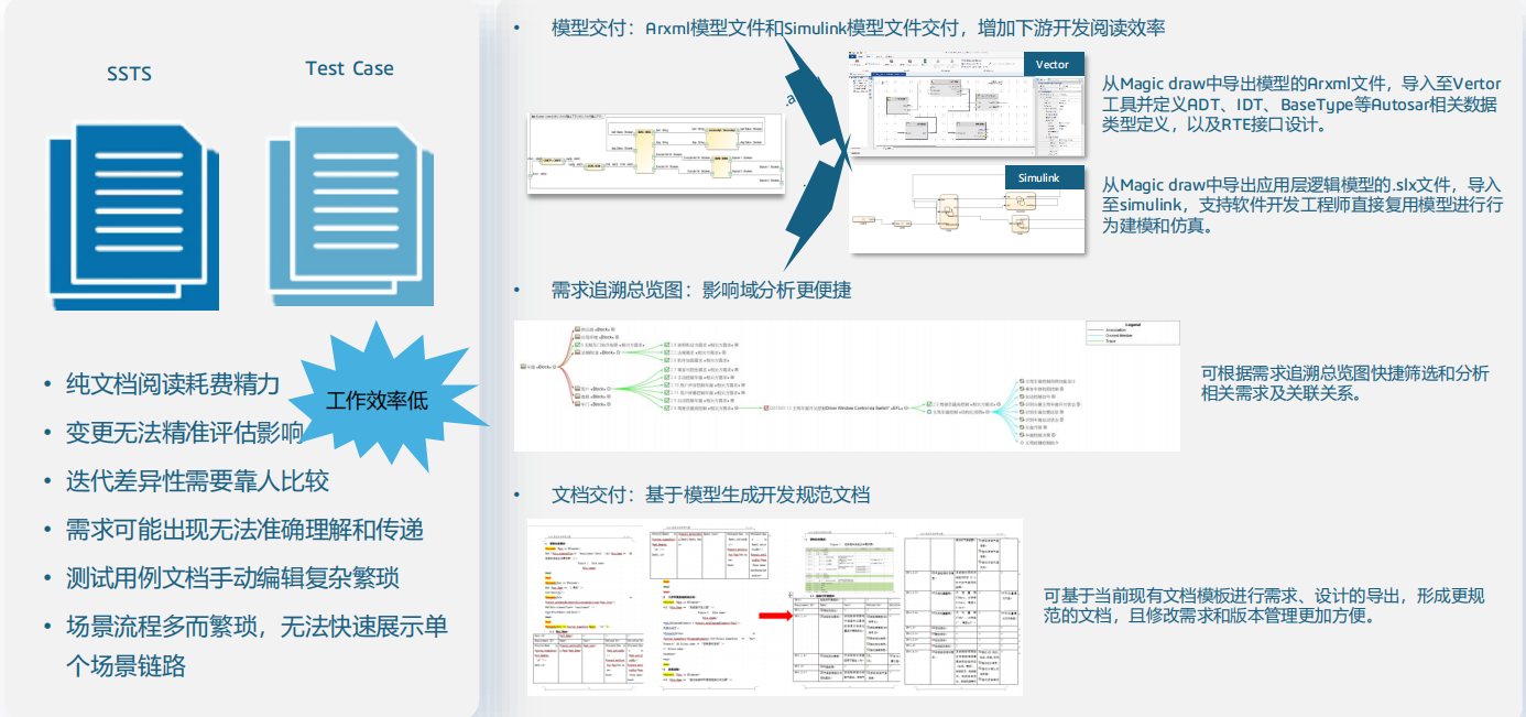 传统研发将问题暴露集中于后期整车集成调试阶段,变更成本呈指数级上升。此外,模型交付格式繁杂(如 Arxml、Simulink 模型文件),下游开发阅读效率低;测试用例文档需手动编辑,复杂场景链路难以快速可视化,进一步拉低工作效率。