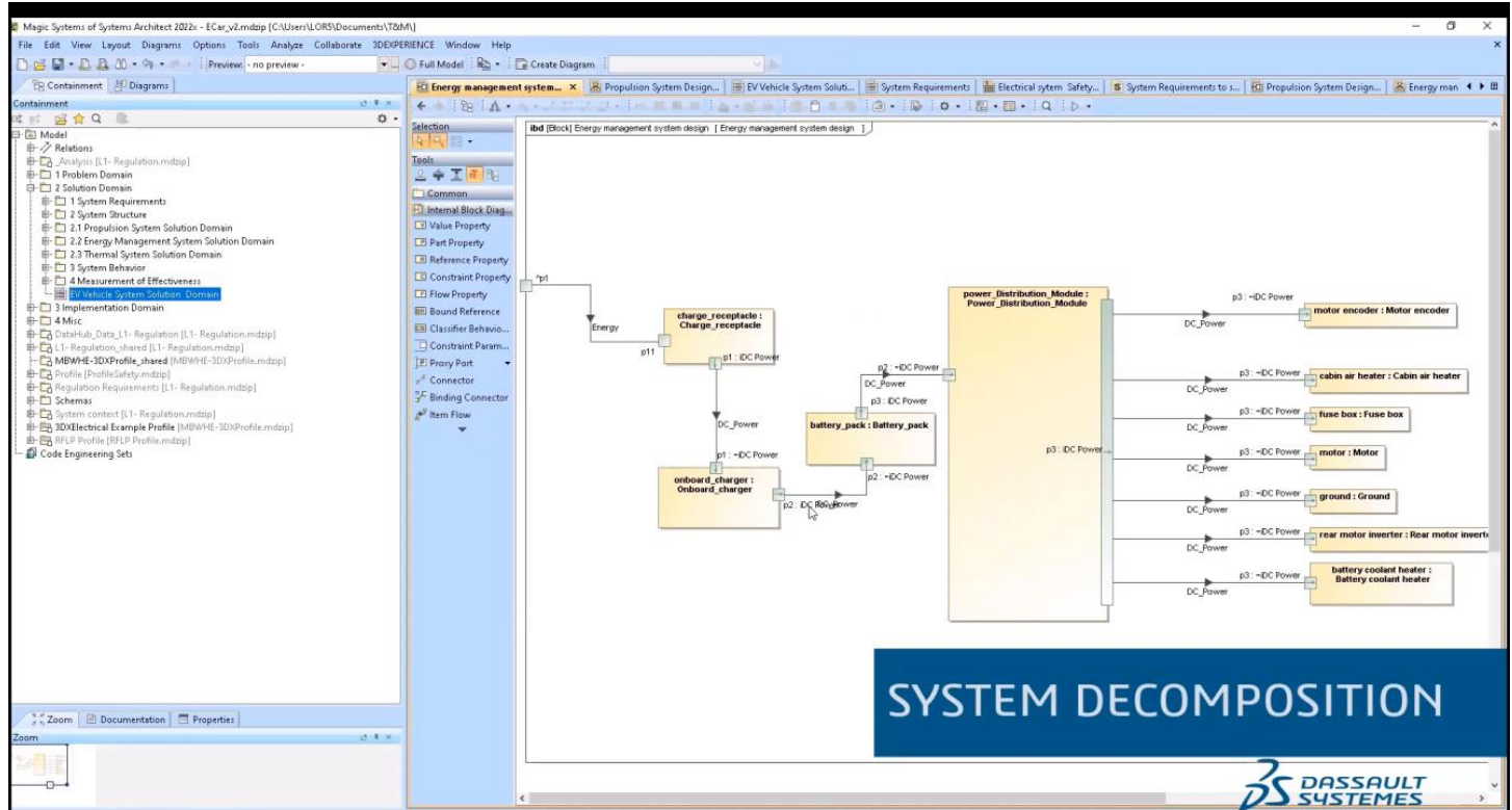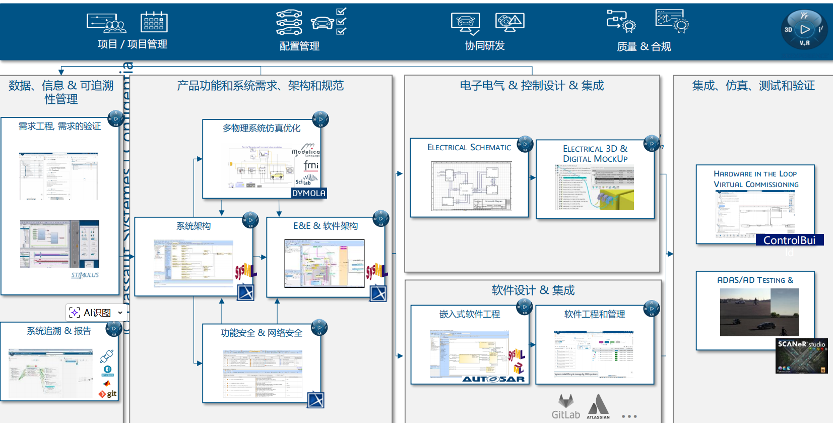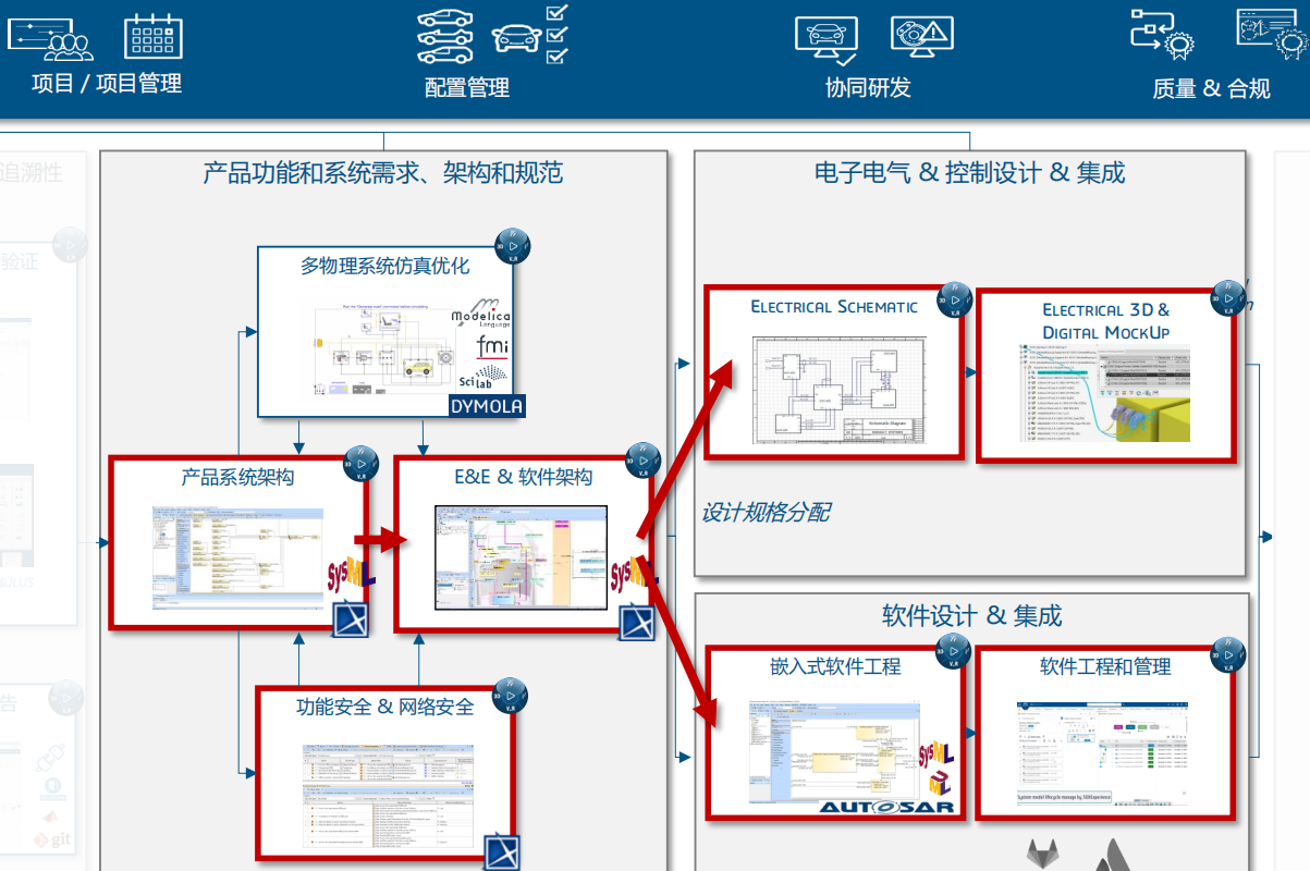 EEA(电子电气架构)及电子电器解决方案,是面向汽车 “三化”(电动化、智能化、网联化)转型背景下,针对车身域电子电气系统复杂度指数级跃升所打造的全生命周期数字化解决方案,核心是依托3DEXPERIENCE 平台与 MBSE框架,打通电子电气系统从需求定义、架构设计、协同开发到集成验证的全流程,破解传统电气研发中的 “设计孤岛、工具割裂、验证滞后” 难题。